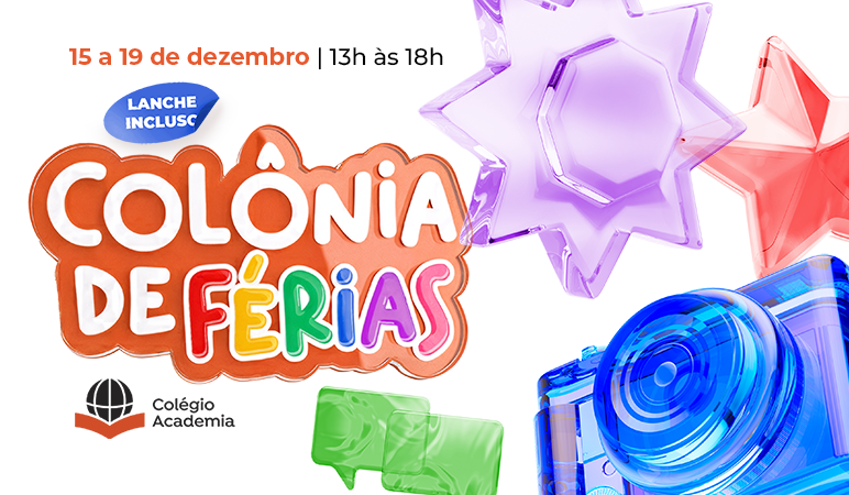 De 15 a 19 de dezembro, das 13h às 18h, viveremos dias de muita alegria, aprendizado e uma programação especial para crianças de 1 a 13 anos na Colônia de Férias do Colégio Academia. Vai ter pista de carrinho de rolimã, atividades aquáticas, infláveis com água, piscina, atividades especiais de Natal e oficina criativa!